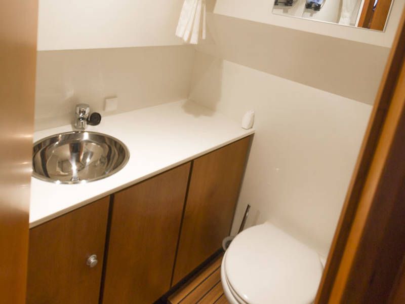 De luxe sanitaire ruimten met elektrisch toilet en wastafel aan stuurboordzijde en een separate doucheruimte met teakhoutenbank aan bakboordzijde. Het schip heeft een boiler voor voldoende warmwater.