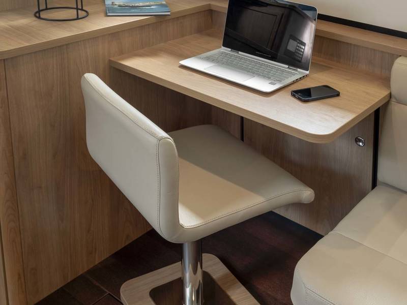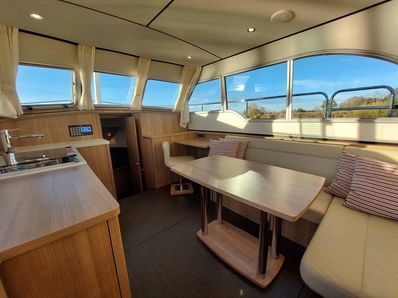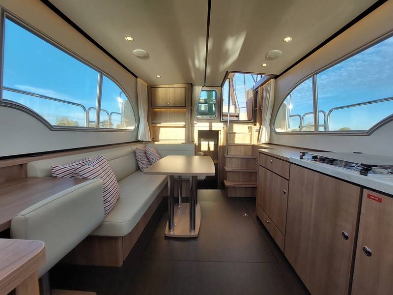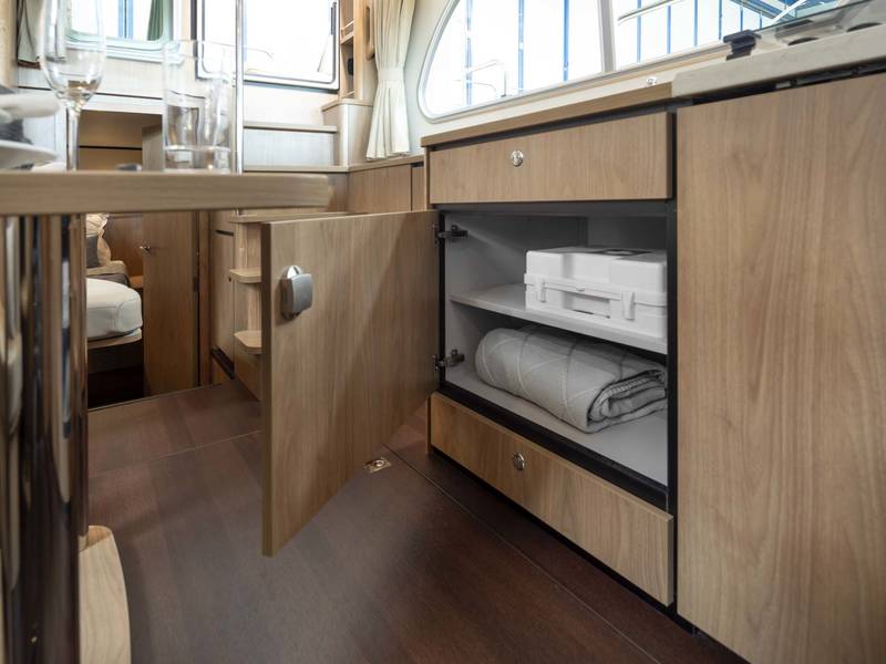 Aan boord in de living is het heerlijk ontspannen met een ruime zithoek (deze is te verstellen naar een derde *Easysleep of lounge bed). De salon kent veel daglicht door de raampartijen, het is echt genieten van het prachtige uitzicht laag over het water. In de salon bevindt zich tevens een groot bergluik in het ruim om alle profiant in op te slaan.